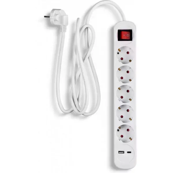 Förlängningskabeln innehåller fem eluttag, en USB-A-port och en USB-C-port, som gör det möjligt att ladda flera mobila enheter samtidigt. USB-portarna är mycket praktiska när du behöver snabb laddning till exempel för din telefon eller surfplatta. USB-C-porten ger snabb laddning för många nya smarttelefonmodeller och bärbara datorer. Denna mångsidighet gör förlängningskabeln till en mycket praktisk och mångsidig tillbehör.
